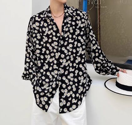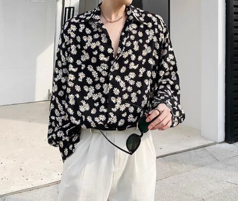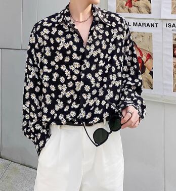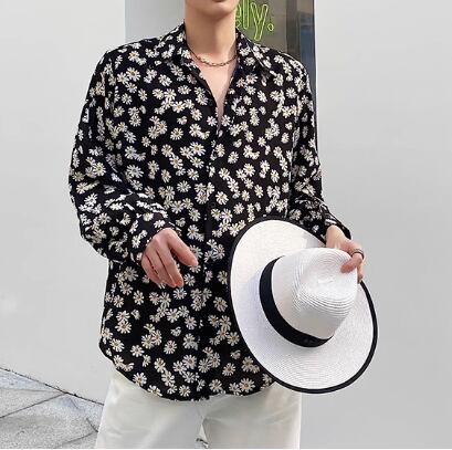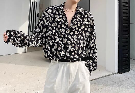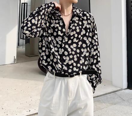 メンズ 男性用 トップス シャツ カジュアルスーツ 前開き ミディアム アシンメトリー 不規則 長袖 襟付き 角襟 オーバーサイズ ボタン カジュアル おしゃれ かっこいい ラフ ルーズ 個性的 存在感 爽やか ハンサム 華やか 花柄 フラワー オールシーズン お出かけ 旅行 休日 バカンス 体型カバー モテ トレンド S M L XL ゆったり ブラック