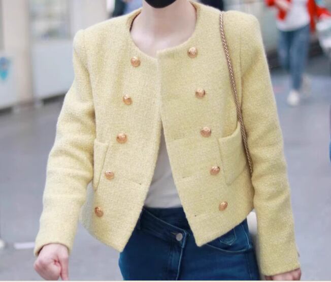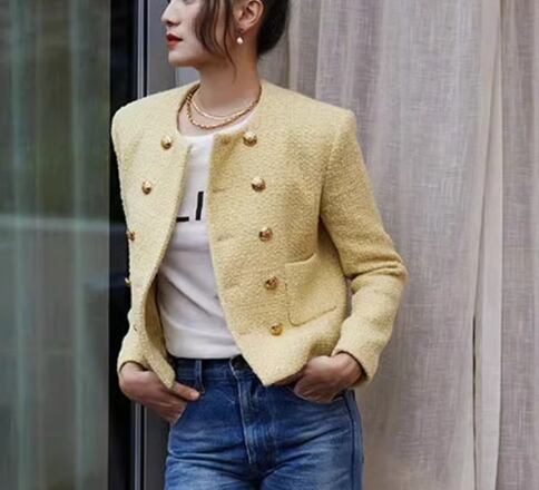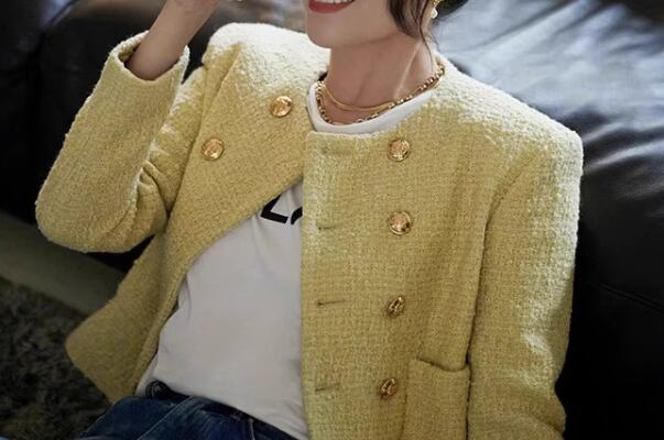 レディース ジャケット 上着 ノーカラージャケット ショート 長袖 ストレート 異国風 ボタン ツイード 大人可愛い きれいめ シンプル 上品 おしゃれ レトロ こなれ感 エレガント 存在感 ラグジュアリー クラシカル セレブリティ シック 高級感 オフィスカジュアル スタイリッシュ 無地 冬 ママ OL デート お出かけ 普段使い 着回し S M L XL イエロー