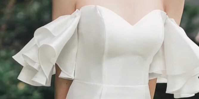 オフショルデザイン×たくさんのフリルが女性らしくて大人可愛いウエディングドレス。