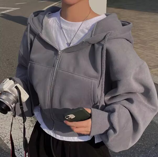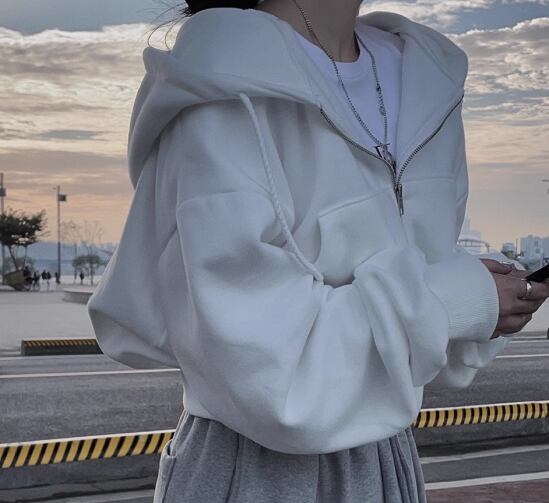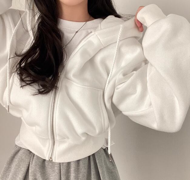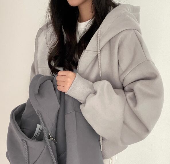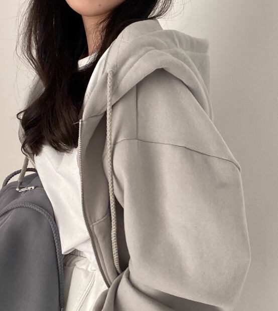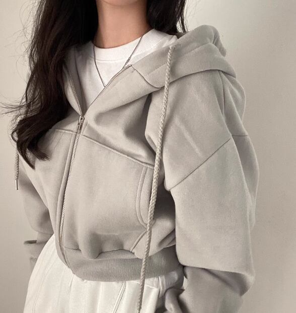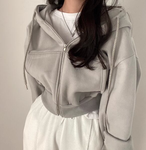 レディース トップス パーカー ショート 長袖 ドロップショルダー ファスナー 前開き フード 綿 スウェット シンプル カジュアル おしゃれ かっこいい レトロ ラフ メンズライク ボーイッシュ スポーティー ルーズ クール ナチュラル リラックス ハンサム シック スタイリッシュ 無地 秋 冬 デート お出かけ 韓国 普段使い 着回し トレンド 流行 M L XL ゆったり ゆる 大きめ オーバーサイズ ホワイト ライトグレー ダークグレー ベージュ