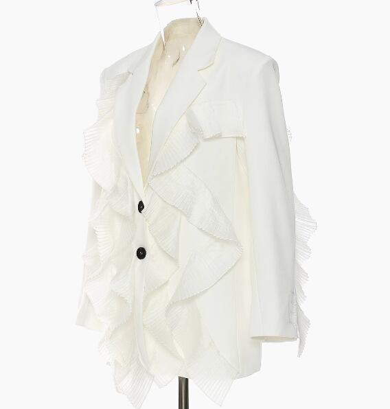 レディース ジャケット スーツ ミドル丈 長袖 襟付き スーツカラー プリーツ フリル ボタン 大人可愛い カジュアル 上品 おしゃれ かっこいい こなれ感 ルーズ 個性的 クール エレガント モダン 存在感 ラグジュアリー ハンサム シック 高級感 オフィスカジュアル 芸術的 アーティスティック 華やか スタイリッシュ 無地 春 OL デート お出かけ 普段使い 着回し S M L ゆったり ホワイト ブラック