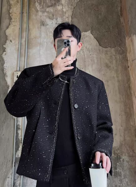 ノーカラーでシンプルながらも、ラメ感が上品に光るデザインは、主役級の存在感を放ちます。都会的でラグジュアリーな雰囲気を演出し、クラシカルなスタイルをお楽しみいただけます。このジャケットは厚手で暖かく、秋冬の装いにぴったりです。男女兼用で、オシャレな大人たちにもおすすめのアイテムです。