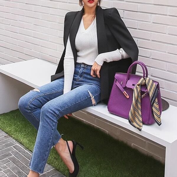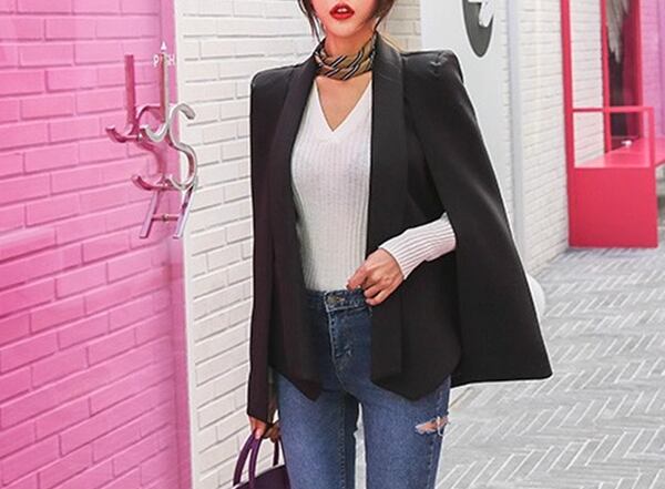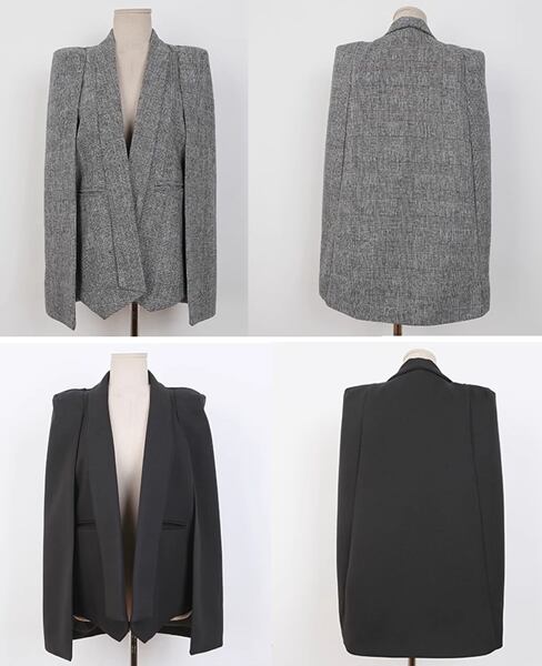 女性のためのケープスーツジャケット。エレガントなスプライシングデザインが特徴で、スリムなシルエットが女性らしい美しさを引き立てます。その存在感は大きく、ビジネスシーンからデイリーのシックなスタイルまで幅広く活躍してくれます。流行に左右されない長く愛用できる一着です