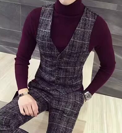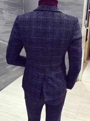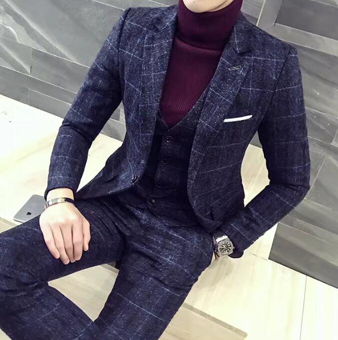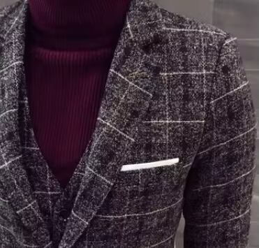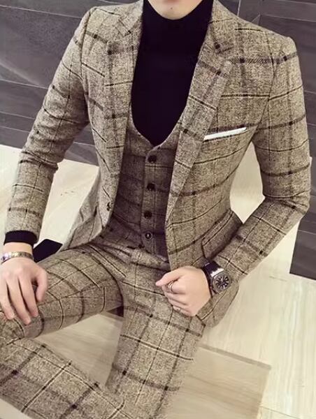 ジャケット、パンツ、ベストの3点セットで、チェック柄がオシャレで上品な印象を与えます。中厚手の生地感は、秋冬の季節にぴったりで、結婚式やパーティー、イベントなどのフォーマルな場面で活躍します。立ち居振る舞いがさらに紳士的に見えるよう、スリムシルエットが採用されています。