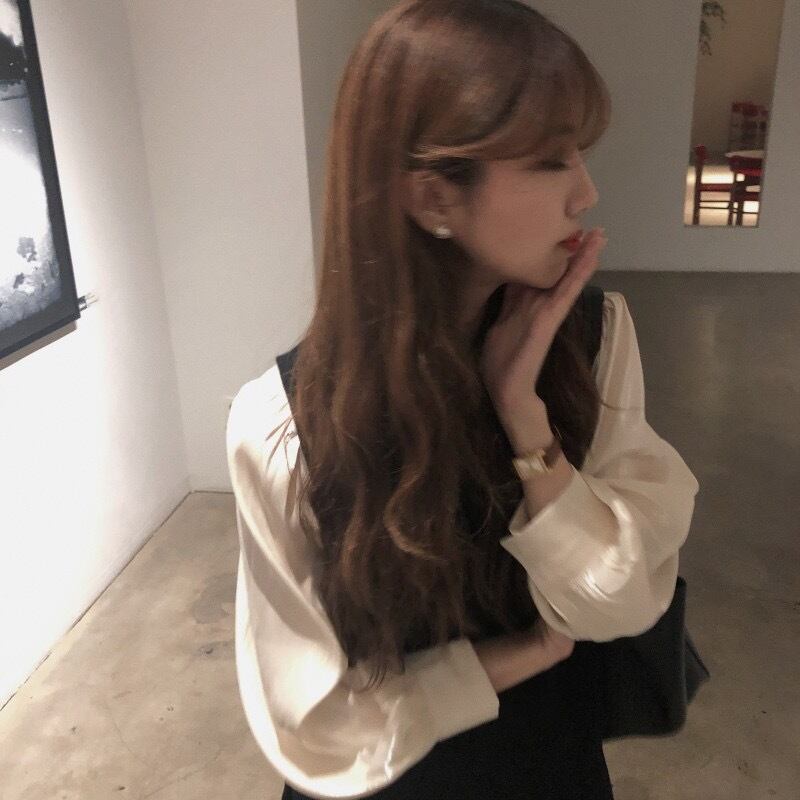 ボリューム袖ブラウスと黒のジャンパースカートのセットアップです。ブラウスは首元のタックネックがポイントでふんわりとしたパフスリーブと光沢感のある生地が大人可愛いデザイン。ジャンパースカートはローウエスト位置にプリーツ切替えを入れたAラインシルエットの膝上丈で、レトロ感のある上品スタイルに。