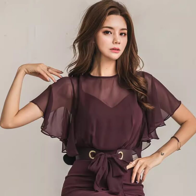 フェイクツーピース レディース スカート ワンピース ドレス タイトスカート 膝丈 半袖 ラウンドネック 襟なし ノーカラー タイト スリム 細身 レース リボン ベルト ウエストマーク ウエストリボン スリット バックスリット ハイウエスト レースアップ 透け感 シースルー 薄手 ベルト付き かわいい 大人可愛い きれいめ シンプル カジュアル 上品 おしゃれ かっこいい レトロ こなれ感 ラフ 個性的 クール モード系 エレガント モダン 主役級 存在感 無地 夏 パーティー イベント 発表会 モテ