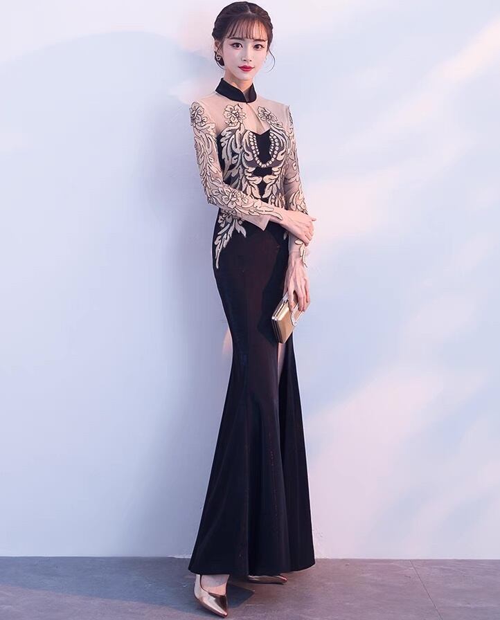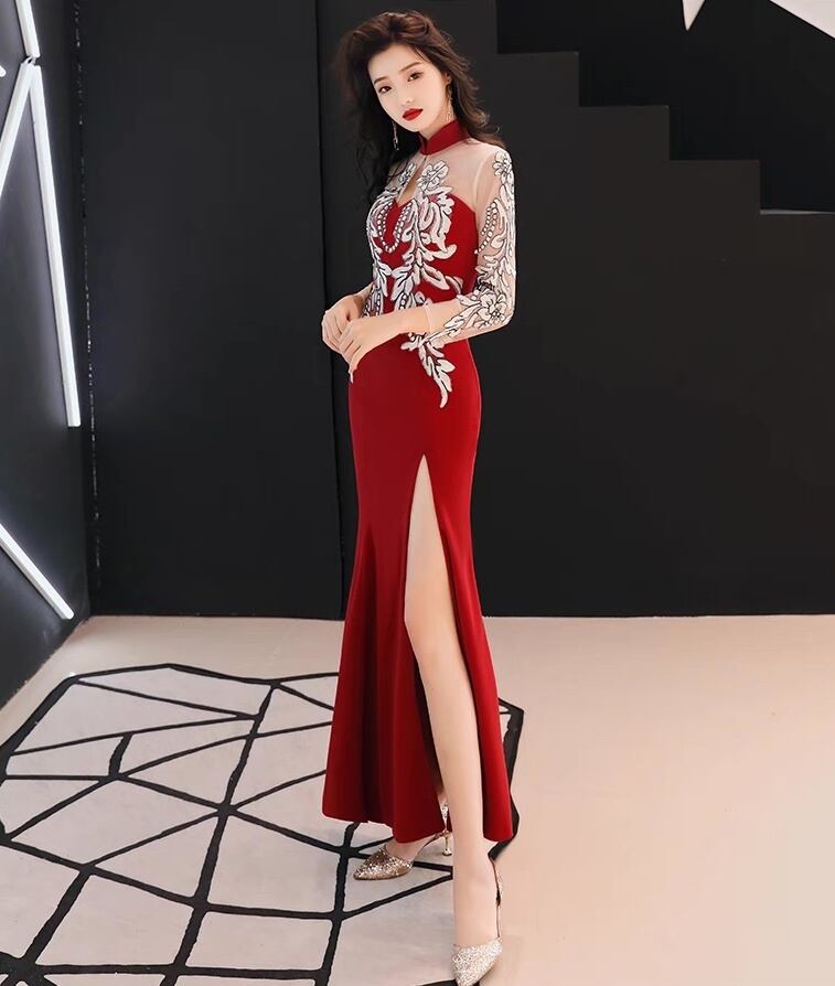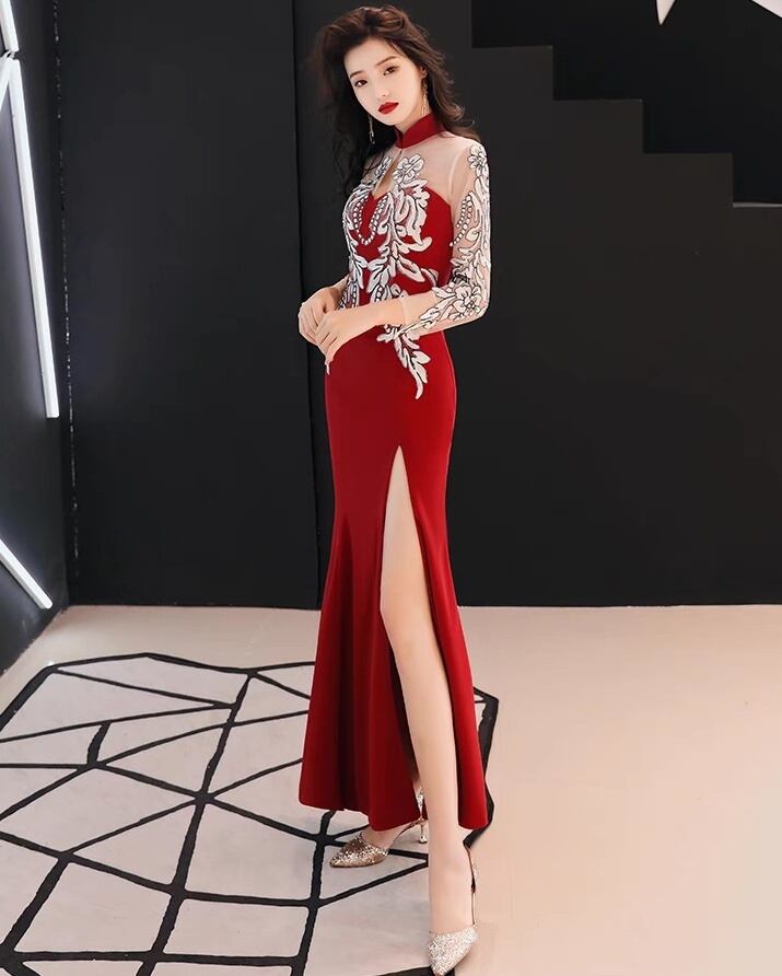 ドレス パーティー 長袖 スタンドカラー マーメイド スレンダー タイト スリム フレア カクテル イブニング 刺繍 切り替えデザイン ドッキング バックシャン バックコンシャス ハイウエスト 透け感 シースルー サイドスリット きれいめ 大人可愛い 上品 おしゃれ エスニック エキゾチック クール エレガント 主役級 存在感 フォーマル 抜け感 ゴージャス エレガント セクシー 華やか 花柄 パーティー イベント 高見え 格上げ 春 夏 秋 ラウンジ クラブ S M L XL 黒 ブラック レッド