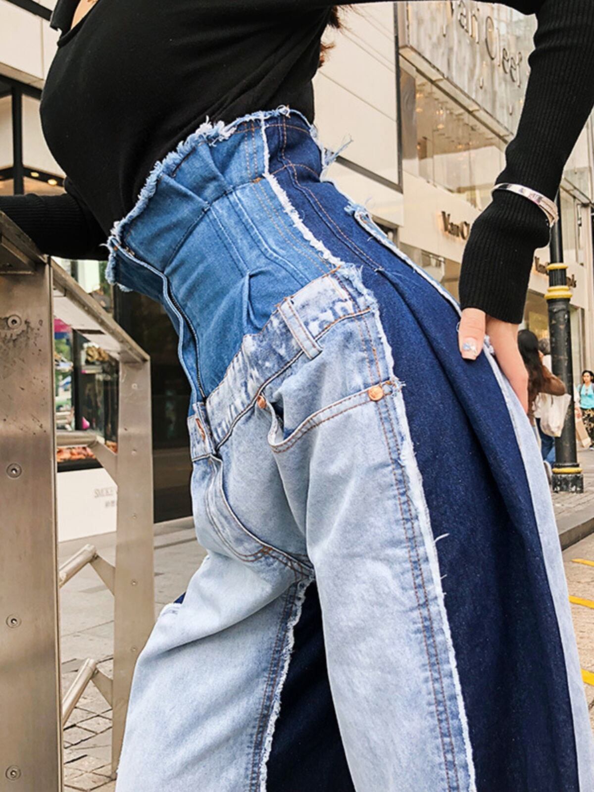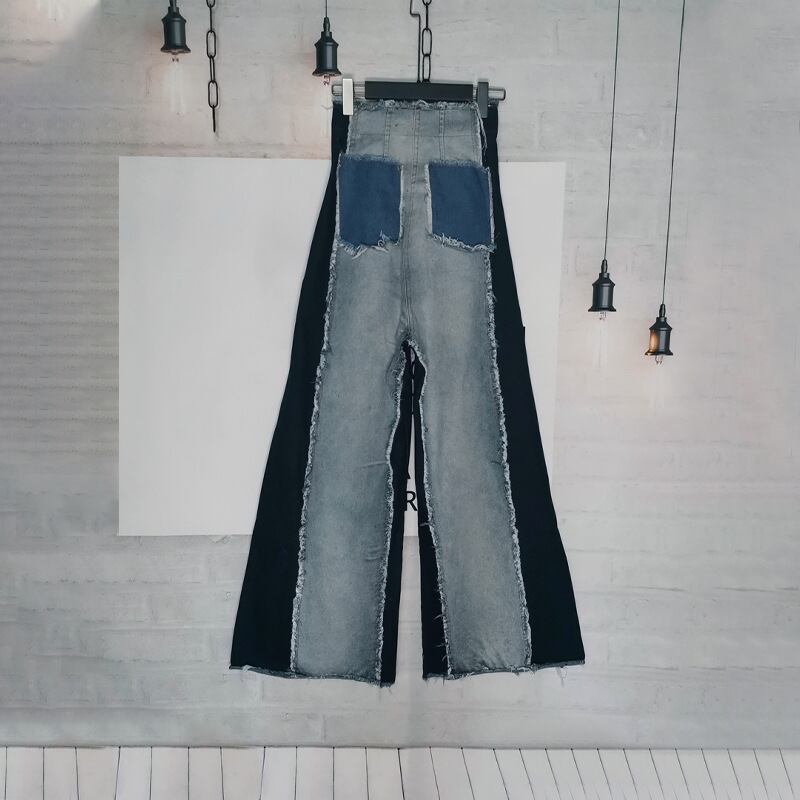 ウォッシュ加工と配色切り替えデザインがおしゃれなワイドレッグデニムパンツです。
