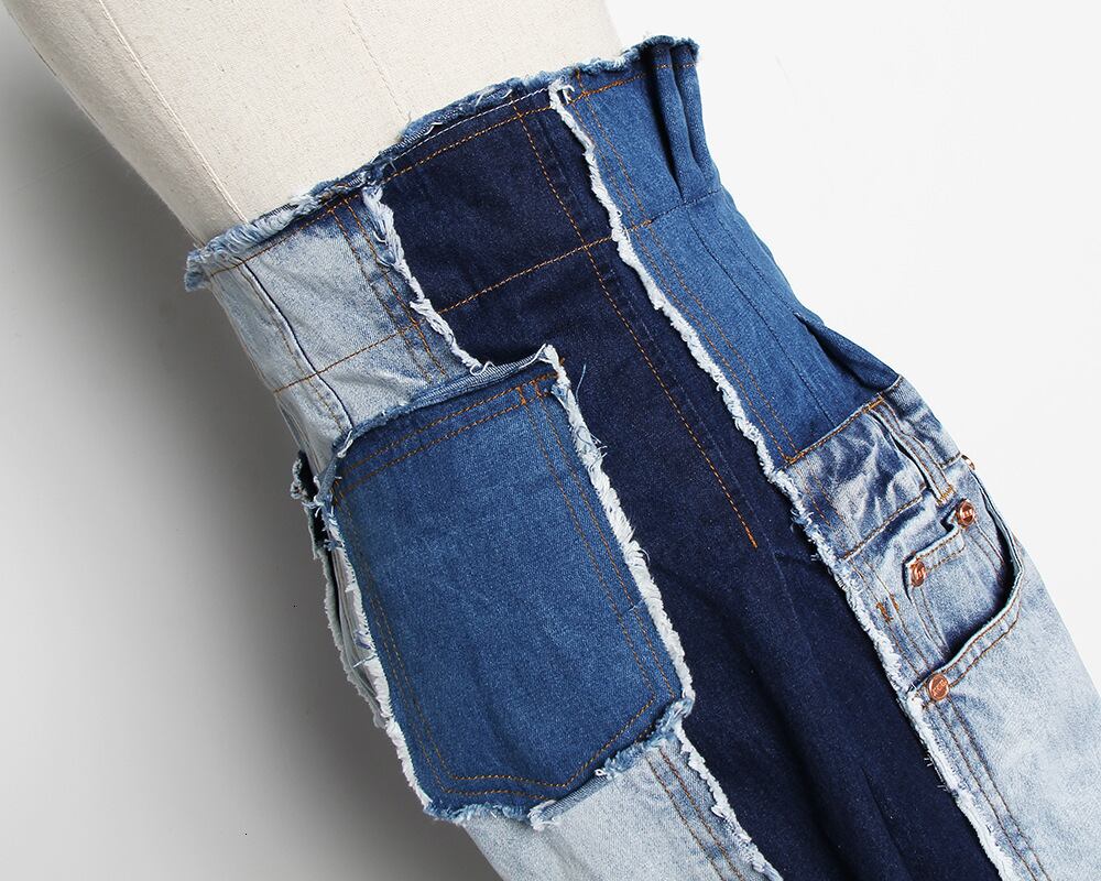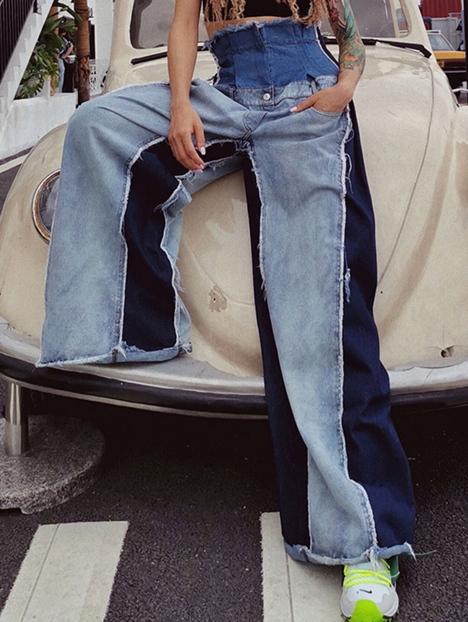 レディース パンツ ボトムス デニム フレアパンツ ジーンズ カジュアルパンツ ワイドパンツ ロング ワイド フレア ブーツカット ウォッシュ 切り替えデザイン 配色 異素材ミックス 大人可愛い カジュアル かっこいい 個性的 存在感 アメリカン ワイルド ステッチ オールシーズン 休日 美脚 脚長 S M L XL 2XL ビッグシルエット ブルー