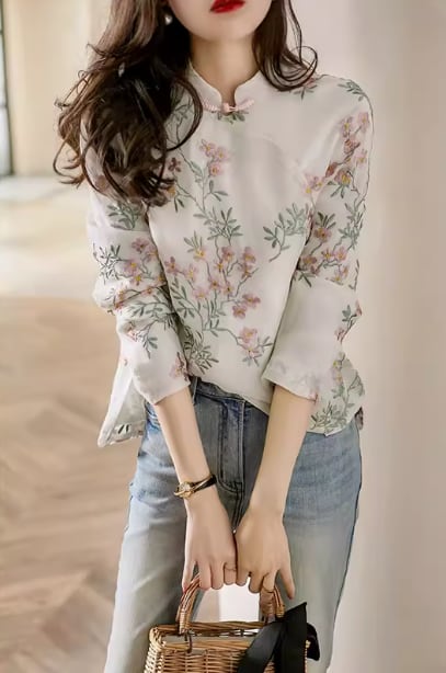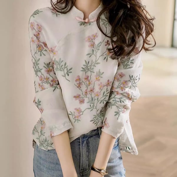上品なスタンドカラーとフェミニンな刺繍が特徴の、レトロな雰囲気漂うブラウスが登場しました。