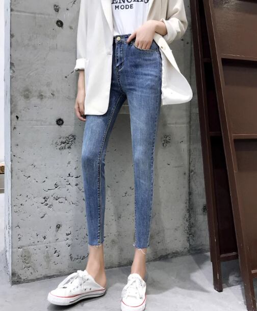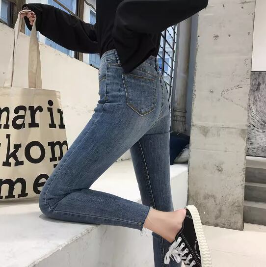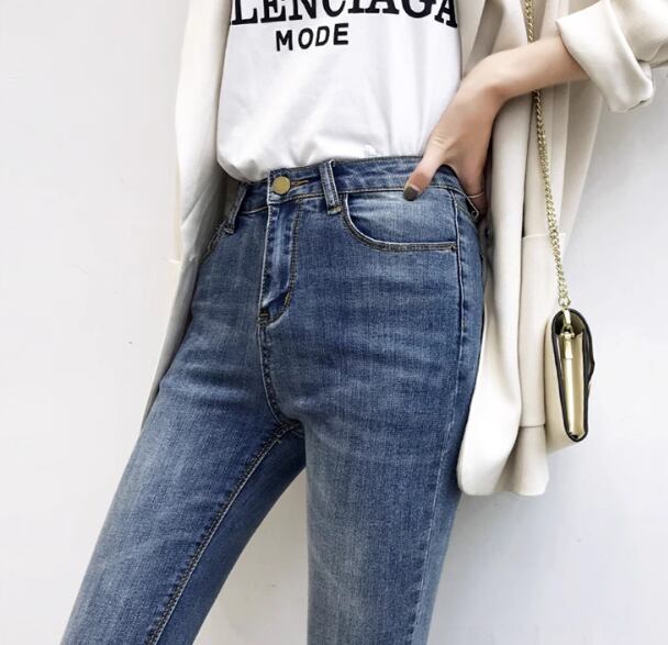 洗練された美脚ラインを演出する、ヴィンテージブルーとブラックのスリムデニムパンツ。
