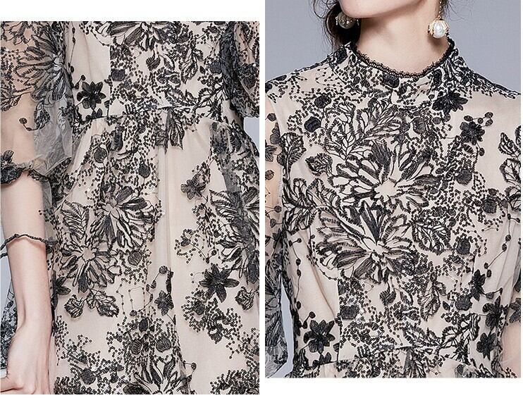 刺繍が華やかな七分袖シースルーミモレ丈ワンピース。