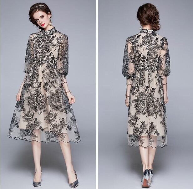 レディース ワンピース ドレス 膝下 ミモレ ロング 7分袖 パフスリーブ バルーン袖 ハイネック 襟なし セミフレア ストレート フェミニン タック 刺繍 ウエストマーク ハイウエスト 透け感 薄手 花柄 フラワー 総柄 春 夏 結婚式 二次会 披露宴 デート お出かけ パーティー イベント レストラン 女子会 休日 ホテル モノトーン オルチャン コーデ プレゼント 体型カバー 脚長 モテ 清楚 S M L XL 2XL 黒 ブラック