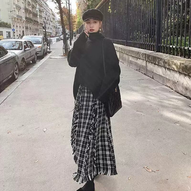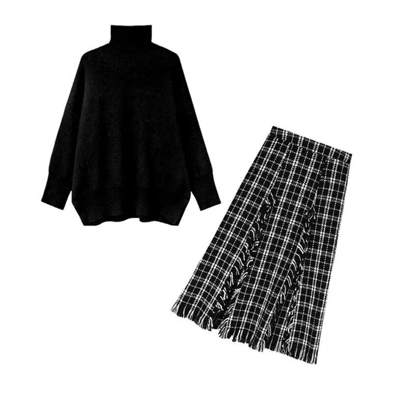レディース セットアップ ツーピース 上下セット トップス ニット セーター プルオーバー スカート フレアスカート ロングスカート ロング 長袖 ドロップショルダー 萌袖 タートルネック ワイド ニット フリンジ かわいい 大人可愛い シンプル カジュアル おしゃれ こなれ感 ラフ ガーリー ルーズ 主役級 抜け感 キュート ベーシック 無地 チェック 秋 冬 デート お出かけ 女子会 休日 カフェ 韓国 オルチャン コーデ 普段使い 着回し L XL 2XL 3XL 4XL ゆったり 黒 ブラック