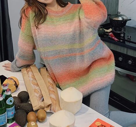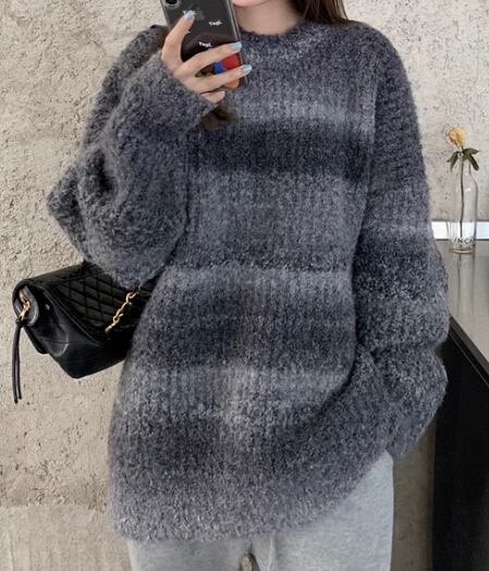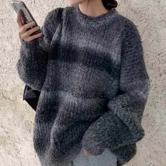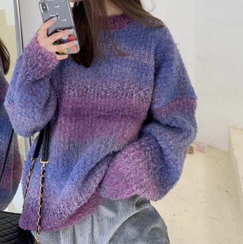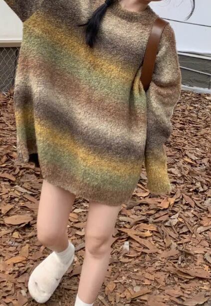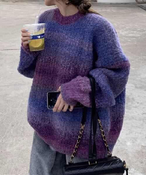 トップス ニット セーター プルオーバー カジュアル 丈長 長袖 ボリューム袖 ラウンドネック ワイド もこもこ ふわふわ ニット 大人可愛い カジュアル エスニック ラフ ボーダー 冬 お出かけ 楽ちん 暖かい 防寒 体型カバー 普段使い S M L XL 2XL ゆったり ビッグシルエット グレー カーキ オレンジ ブルー パープル グラデーション