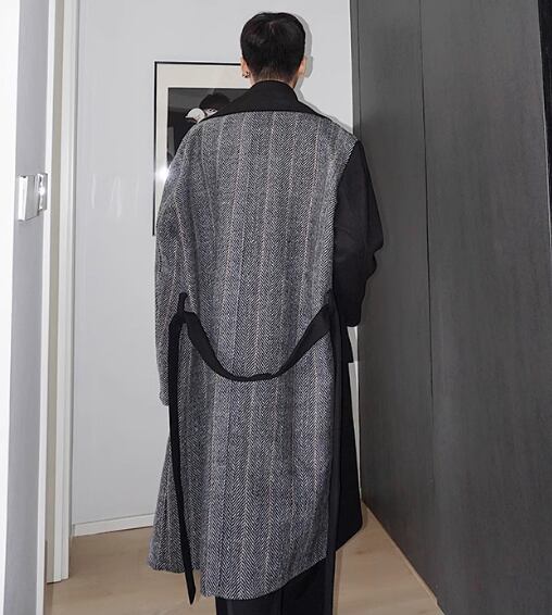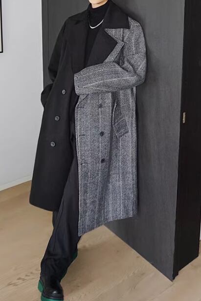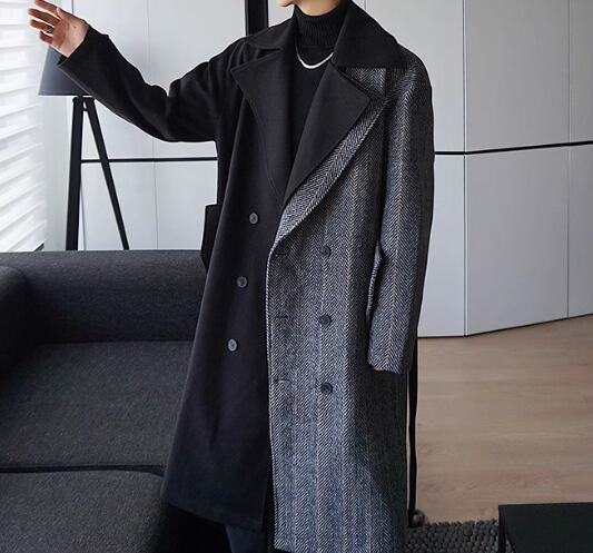 メンズ 男性用 スーツ風 重ね着風 フェイクレイヤード フェイクツーピース コート ウール ミディアム 膝下 ミドル丈 長袖 Vネック 襟付き ポケット ボタン バイカラー 配色 異素材ミックス ベルト付き 上品 おしゃれ かっこいい クール 主役級 存在感 都会的 ハンサム シック 高級感 無地 ストライプ 冬 デート 暖かい 防寒 モテ M L XL ゆったり ビッグシルエット ブラック バイカラー