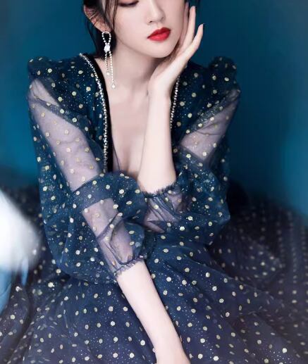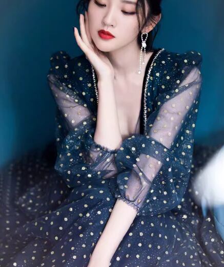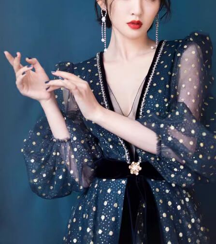 レディース ドレス イブニングドレス パーティードレス ロング 長袖 Vネック ウエストマーク ハイウエスト 透け感 メッシュ かわいい 大人可愛い カジュアル 上品 おしゃれ レトロ ガーリー 個性的 エレガント 存在感 抜け感 キュート ラグジュアリー シック 高級感 芸術的 アーティスティック 華やか スタイリッシュ 水玉 春 デート お出かけ パーティー イベント S M L XL ブルー