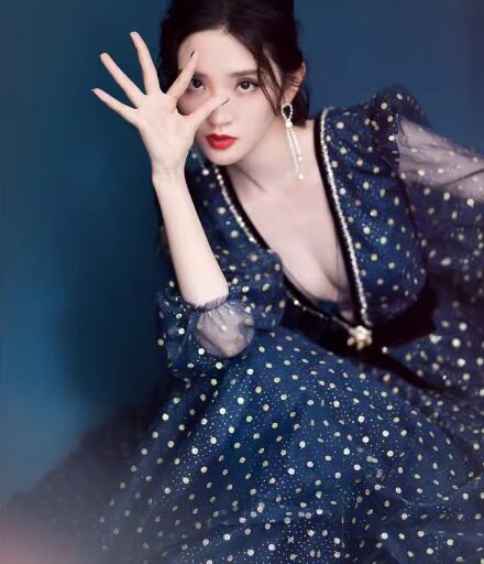 爽やかで上品なブルーの色味ととレトロな雰囲気の水玉模様が魅力的な長袖のロングドレス。