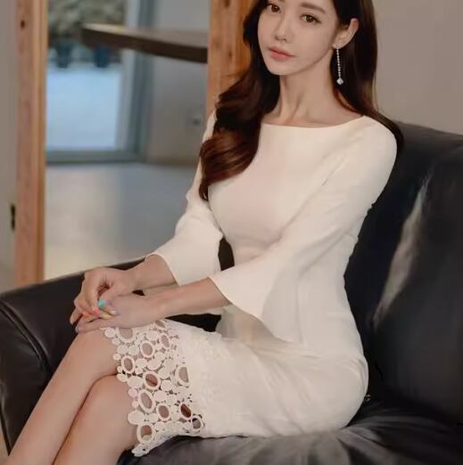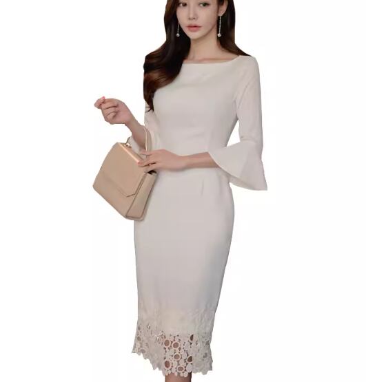レディース ワンピース ドレス タイトスカート ペンシルスカート 膝丈 ミモレ ミドル丈 7分袖 ベルスリーブ ラウンドネック スリム 細身 レース ファスナー ハイウエスト 大人可愛い きれいめ シンプル 上品 おしゃれ こなれ感 ガーリー エレガント ラグジュアリー ナチュラル 知的 セクシー シック 高級感 優しい 無地 春 秋 デート お出かけ パーティー イベント S M L XL 小さめ ホワイト