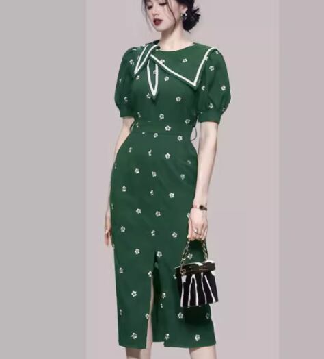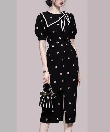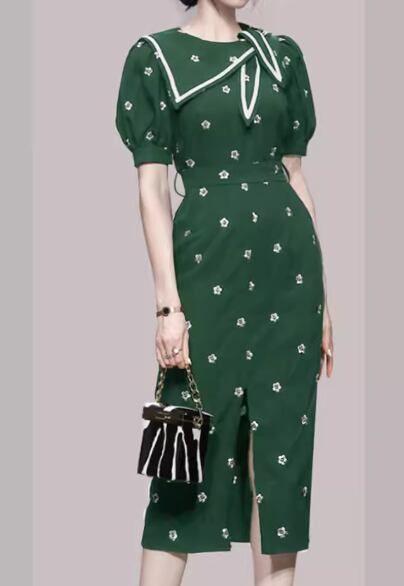 レディース ワンピース ドレス ロング 半袖 パフスリーブ ラウンドネック Aライン フェミニン 刺繍 ウエストマーク スリット ファスナー ハイウエスト かわいい 大人可愛い きれいめ 上品 おしゃれ レトロ ガーリー 個性的 エレガント キュート クラシカル シック 高級感 スタイリッシュ 花柄 夏 デート お出かけ パーティー イベント 普段使い 清楚 トレンド 流行 S M L XL ブラック グリーン