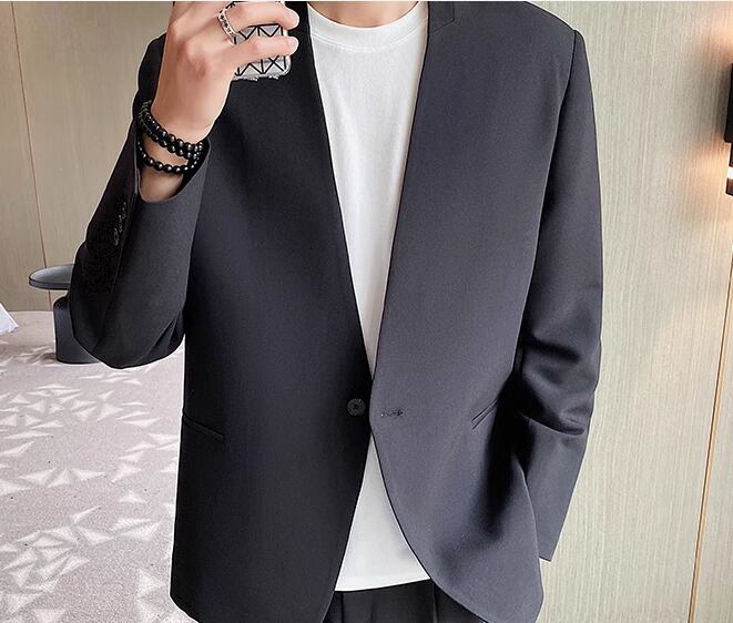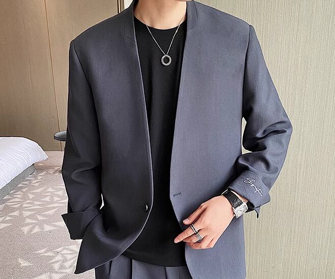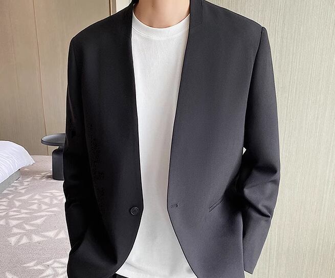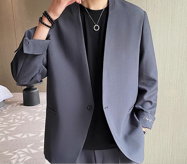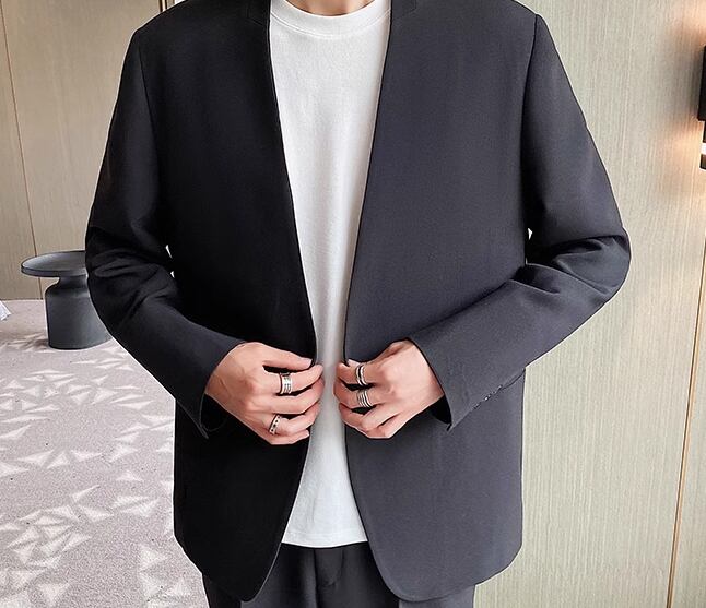 メンズ 男性用 二点セット 上下セット ツーピース ジャケット パンツ スーツ セットアップ ノーカラージャケット フルレングス 長袖 襟なし ストレート シンプル カジュアル 上品 おしゃれ かっこいい こなれ感 クール エレガント ナチュラル 知的 清潔感 爽やか ハンサム シック スタイリッシュ 無地 春 オフィス ビジネス 通勤 デート お出かけ 韓国 普段使い 着回し モテ S M L XL ブラック グレー