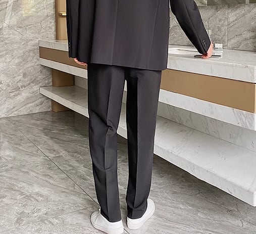 襟のないノーカラージャケットとフルレングスのパンツの二点セット。