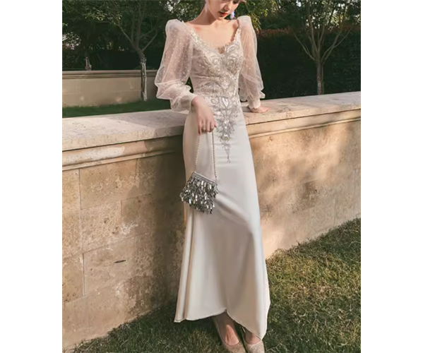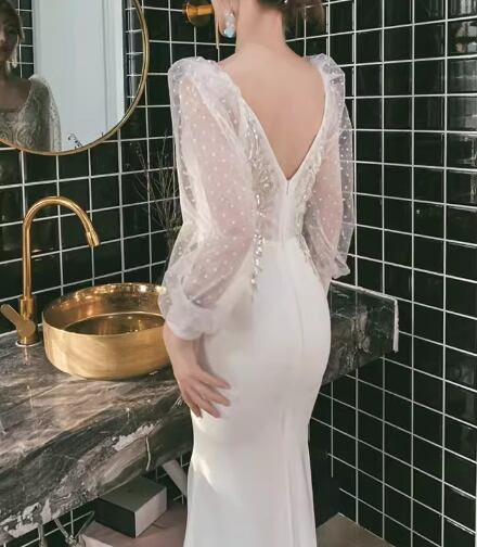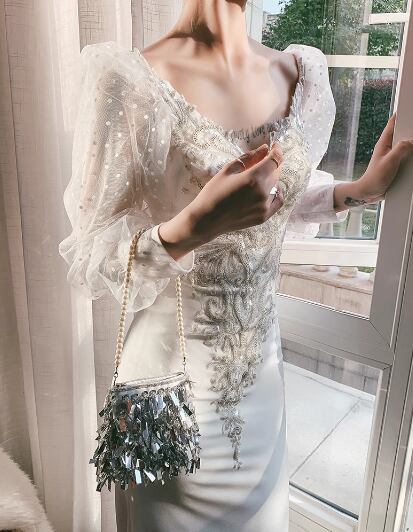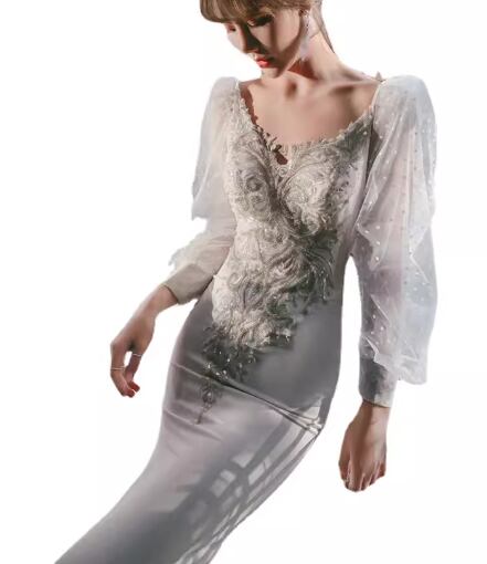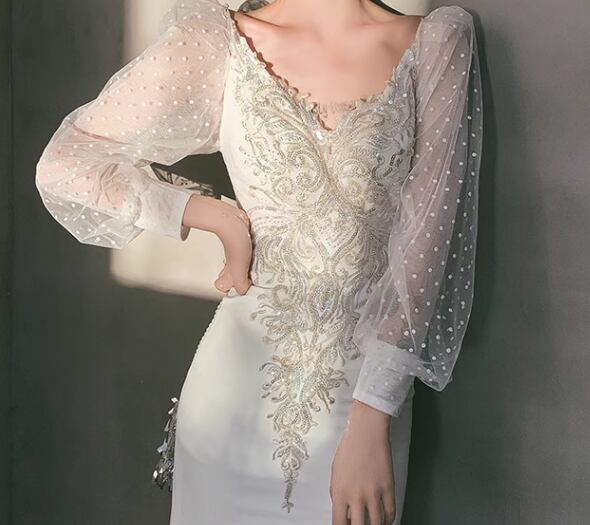 レディース ドレス イブニングドレス パーティードレス ロング 長袖 Vネック タイト スリム 細身 背中開き フィッシュテール 透け感 大人可愛い きれいめ 上品 おしゃれ こなれ感 エレガント ラグジュアリー セクシー シック 高級感 芸術的 アーティスティック スタイリッシュ 秋 パーティー イベント モテ XS S M L XL 小さいサイズ 小さめ ホワイト 大人デザイン