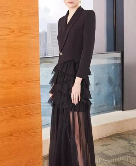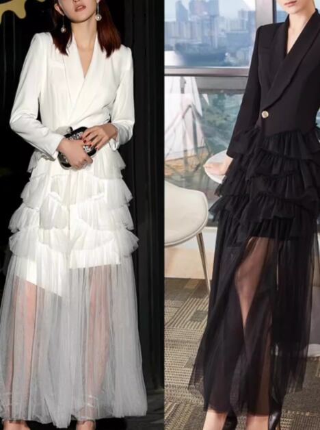 レディース ドレス イブニングドレス パーティードレス ケーキスカート ロング 長袖 襟付き スーツカラー Aライン ファスナー ハイウエスト 切り替えデザイン ドッキング メッシュ 大人可愛い きれいめ 上品 おしゃれ かっこいい こなれ感 個性的 クール エレガント モダン 主役級 存在感 ラグジュアリー セレブリティ ハンサム シック 高級感 芸術的 アーティスティック 華やか スタイリッシュ 無地 秋 パーティー イベント S M L XL ホワイト ブラック