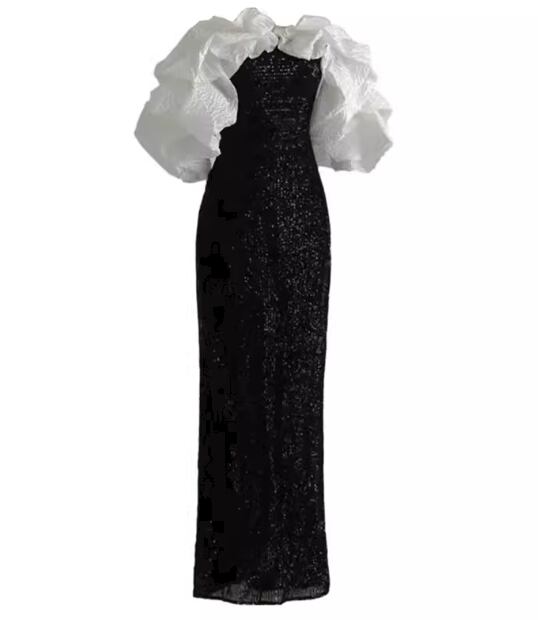 ブラック×ホワイトのシックなモノトーンカラーが大人可愛いノースリーブのロングドレス。