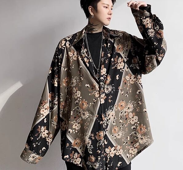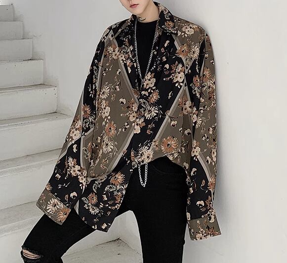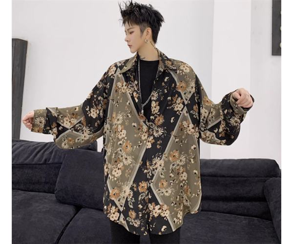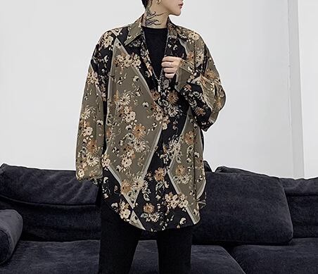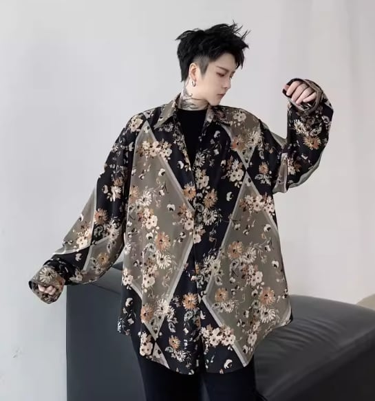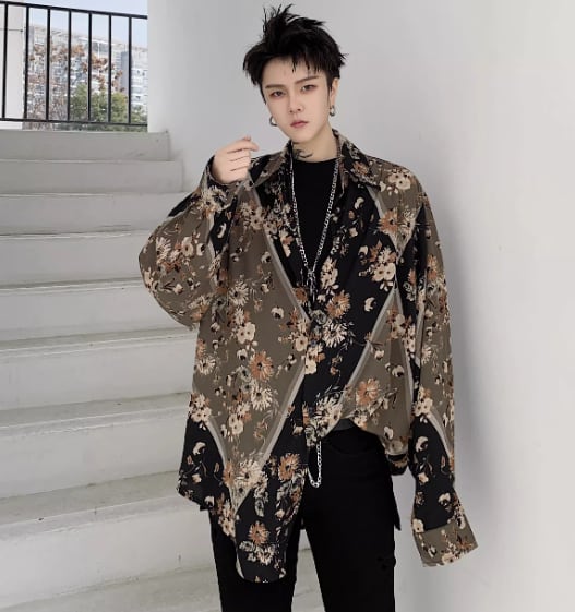 メンズ 男性用 トップス シャツ ミドル丈 長袖 襟付き シフォン 大人可愛い きれいめ カジュアル 上品 おしゃれ かっこいい こなれ感 個性的 クール エレガント モダン 存在感 ラグジュアリー セレブリティ セクシー ハンサム シック 高級感 芸術的 アーティスティック 華やか スタイリッシュ 高貴 花柄 フラワー プリント 春 夏 秋 10代 20代 学生 デート お出かけ 普段使い 着回し トレンド 流行 M L XL カーキ