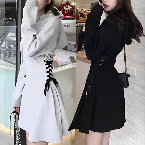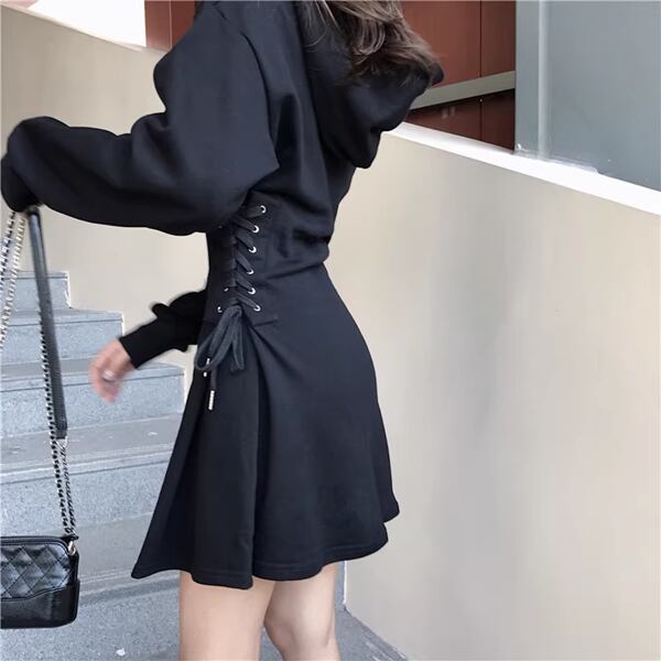 2色展開フード付き長袖スウェットワンピ レディース スカート トップス ワンピース スウェット ドレス ショート 膝上 長袖 萌袖 フード ヘッジ ミディアム スリムフィット ウエストストラップ スリム 上品 おしゃれ エレガント 無地 春 秋 10代 20代 通勤 レストラン ショッピング 韓国 S M L ブラック ライトグレー