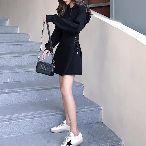ヘップバーンスタイルのフード付き長袖スウェットワンピです。このドレスは、洗練されたフレンチスタイルとモダンなデザインが都会的な女性の魅力を際立たせます。エレガントさとカジュアルな快適さが見事に融合したこのドレスは、着る人の自信と個性を輝かせる一着です。