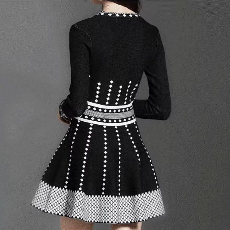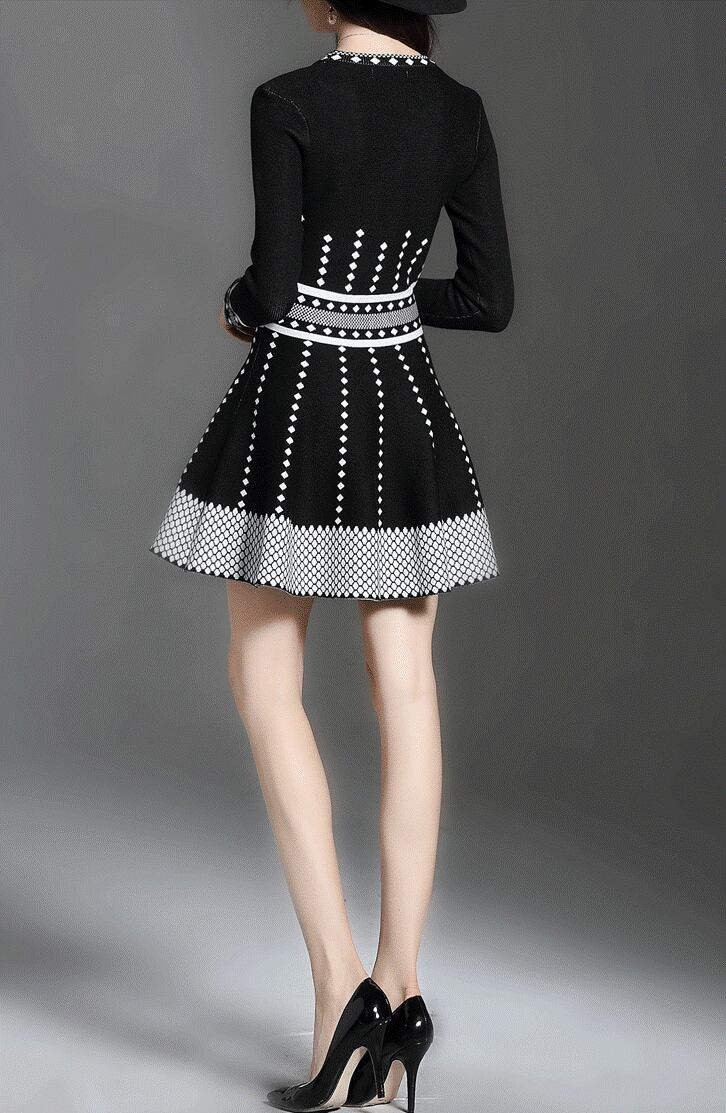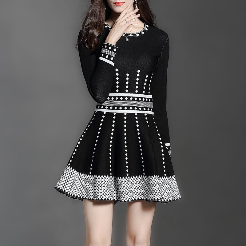 ニットワンピ 足見せ レディース ワンピース マイクロミニ ミニ 膝上 長袖 ラウンドネック 襟なし Aライン フィットアンドフレア ハイウエスト ニット ストレッチ 伸縮性 かわいい 大人可愛い きれいめ シンプル カジュアル 上品 おしゃれ レトロ 個性的 存在感 フェミニン ジオメトリックパターン 幾何学調模様 春 秋 冬 女の子 学生 学校 通学 デート お出かけ 旅行 女子会 休日 ショッピング 韓国 オルチャン コーデ 脚長 普段使い インスタ映え S M L XL 黒 ブラック モノトーン