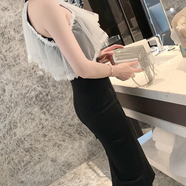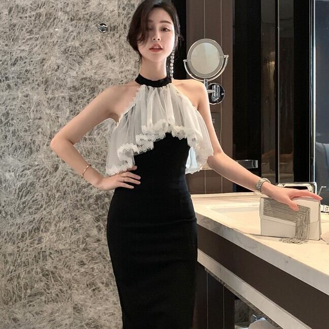 メッシュフリル重ね レディース ワンピース ドレス 膝下 ミモレ ミディアム丈 袖なし アメリカンスリーブ ハイネックホルターネック タイト スリム 細身 刺繍 チュール バックスリット 透け感 シースルー 異素材ミックス かわいい 大人可愛い きれいめ シンプル 上品 おしゃれ 個性的 エレガント 存在感 抜け感 フェミニン セクシー 女っぽ 無地 春 夏 秋 ハロウィン クリスマス バレンタイン ママ 女の子 パーティー イベント 韓国 オルチャン インスタ映え S M L 黒 ブラック バイカラー