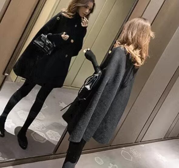 マント風のデザインがおしゃれでスタイリッシュなウール素材のケープコート。