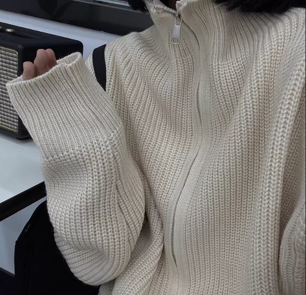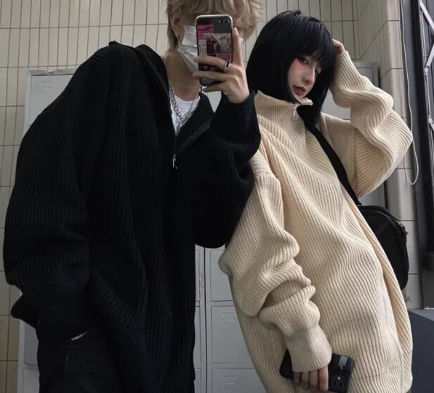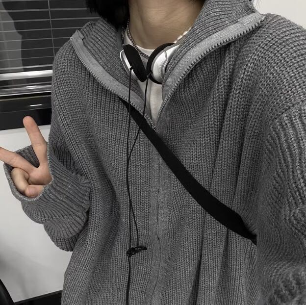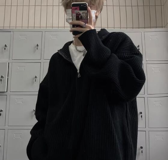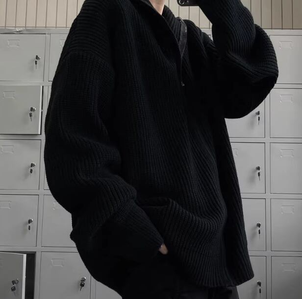 メンズ 男性用 ニット セーター パーカー ミドル丈 長袖 スタンドカラー ファスナー 厚手 シンプル カジュアル おしゃれ かっこいい レトロ ラフ ルーズ クール モダン ナチュラル シック スタイリッシュ 無地 春 秋 カップル デート お出かけ 普段使い 着回し トレンド 流行 M L XL ゆったり ゆる 大きめ オーバーサイズ ブラック グレー アプリコット
