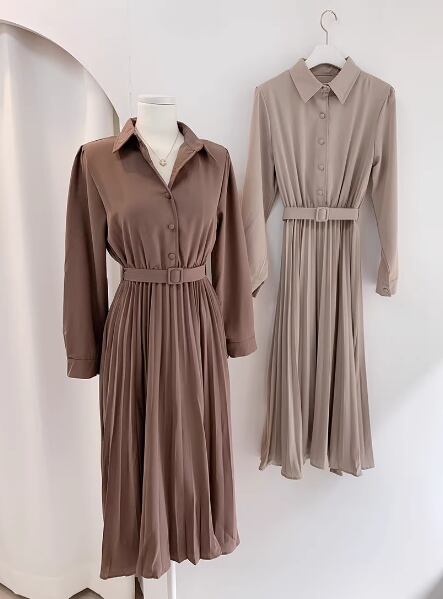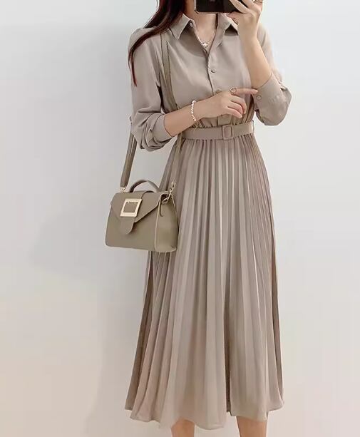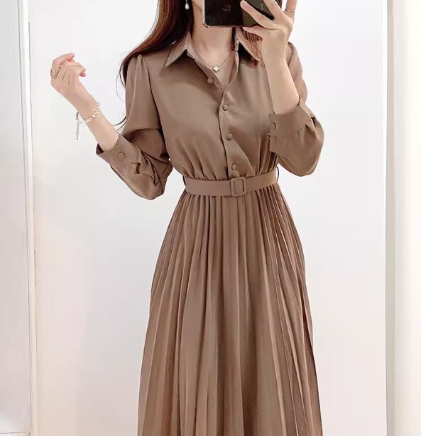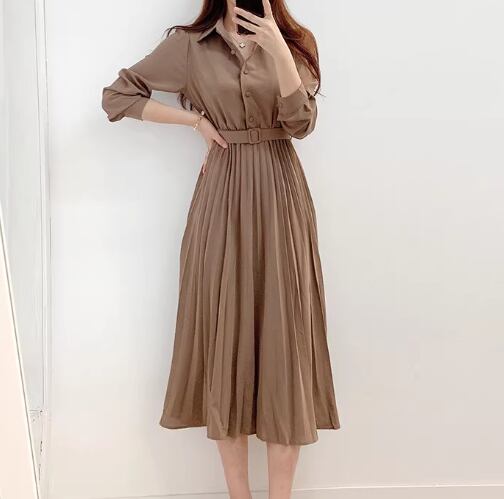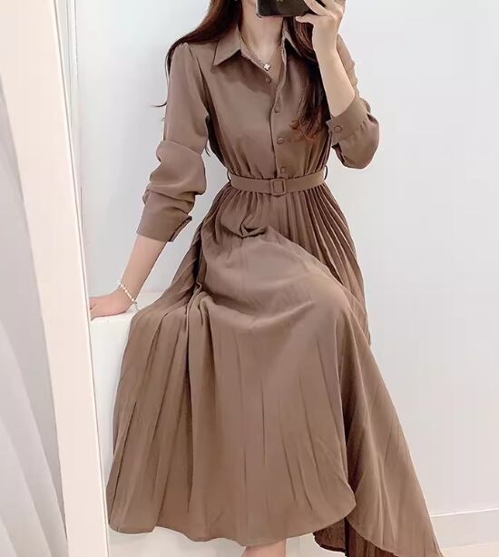 レディース ワンピース シャツワンピ ロング 長袖 襟付き プリーツ ベルト ウエストマーク ハイウエスト ボタン 大人可愛い きれいめ シンプル カジュアル 上品 おしゃれ こなれ感 ガーリー エレガント ラグジュアリー ナチュラル 知的 清潔感 シック 高級感 優しい 無地 秋 OL デート お出かけ 普段使い モテ 清楚 S M L ブラウン アプリコット 秋カラー