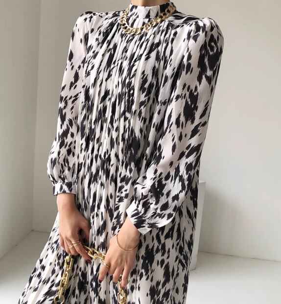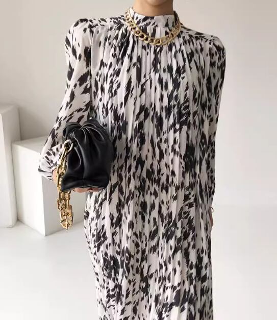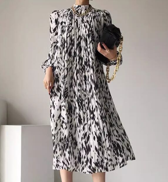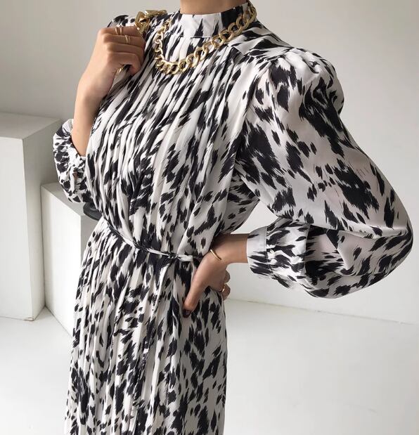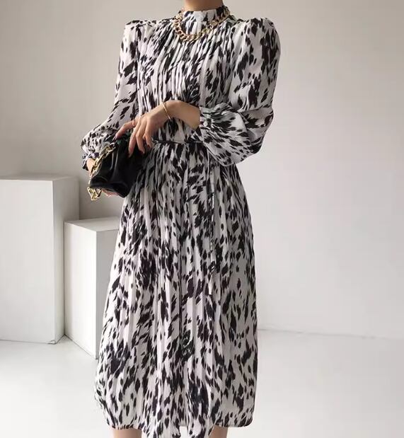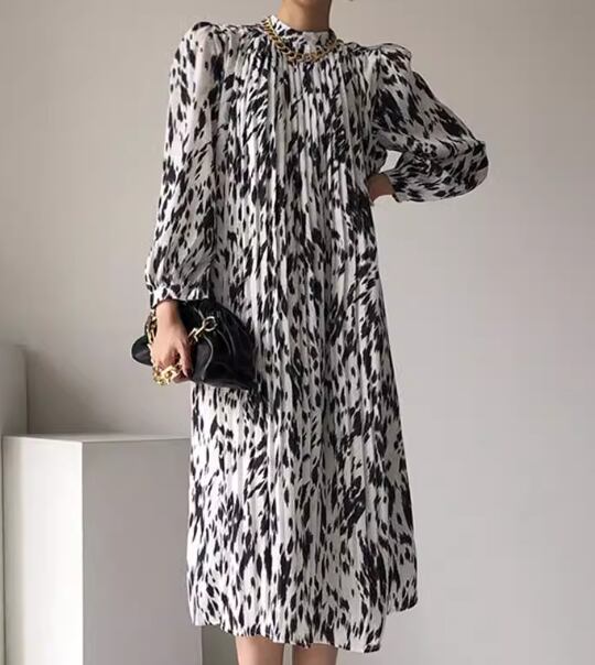 レディース ワンピース ドレス ミモレ 長袖 スタンドカラー プリーツ シフォン ウエストマーク ハイウエスト 異国風 大人可愛い きれいめ 上品 おしゃれ レトロ こなれ感 個性的 エレガント 存在感 ラグジュアリー シック 高級感 華やか プリント 秋 OL デート お出かけ モノトーン 韓国 普段使い フリーサイズ ホワイト 大人デザイン