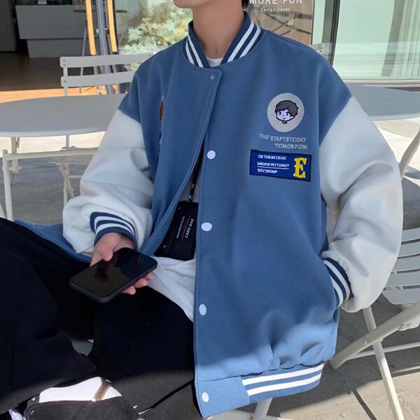 3色展開 ベースボールジャケットメンズ レディース ユニセックス トップス ジャケット ブルゾン アウター スポーツウェア スタジャン 長袖 ラウンドネック シングルブレスト ワイド オーバーサイズ 無地 バイカラー ストリート カジュアル カレッジ風 学生風 ステッチ ロゴ 春 秋 冬 男女兼用 10代 20代 通勤 通学 アウトドア ガーデン