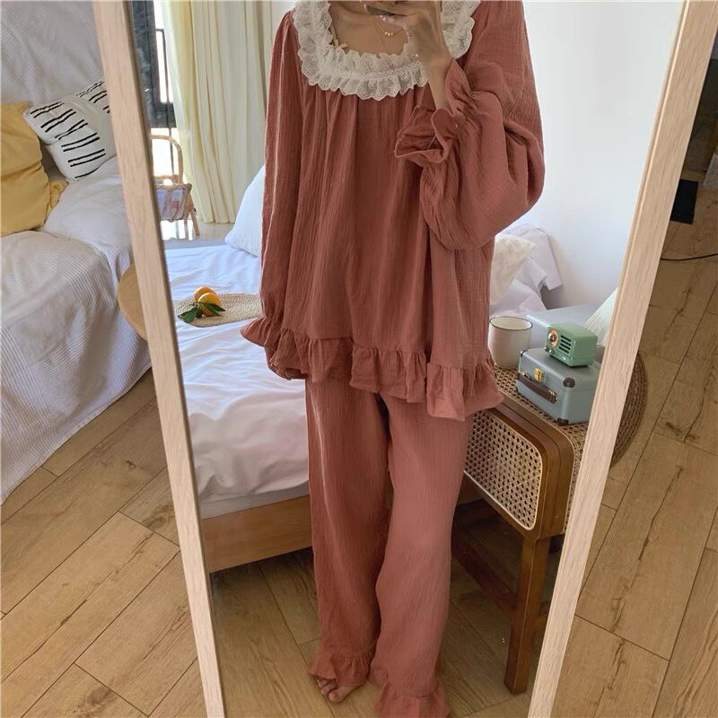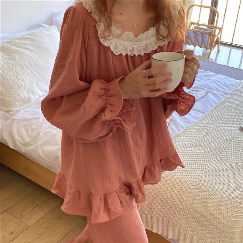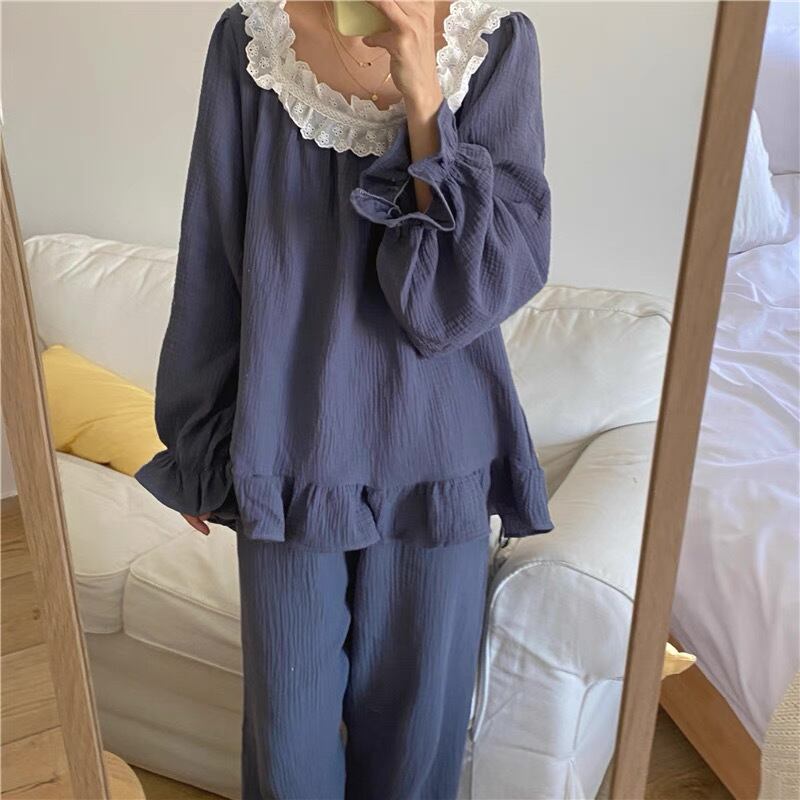 レディース ルームウェア パジャマ プルオーバー 部屋着 セットアップ 上下セット 2点セット ホームウエア 長袖 パフスリーブ フリル袖 ラウンドネック セパレート フェミニン レース ウエストゴム かわいい 大人可愛い シンプル カジュアル おしゃれ こなれ感 ラフ ガーリー ルーズ ラブリー キュート プリンセス ナチュラル 無地 春 秋 お泊まり 休日 韓国 オルチャン コーデ コーディネート スタイル 楽ちん モテ 清楚 デイリー フリーサイズ ワンサイズ カラー ブルー レッド くすみカラー