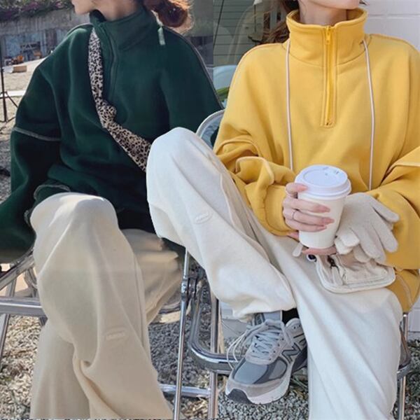 2色展開 スタンドアップカラートップス レディース レイジー オーバーサイズ アメリカンレトロ ハイエンドトップ トップス ジャケット プルオーバー トレーナー スウェット ポロカラー スマート 伸縮性 シンプル カジュアル ルーズ アメリカン 無地 春 秋 10代 20代 通勤 通学 アウトドア キャンプ ガーデン カフェ
