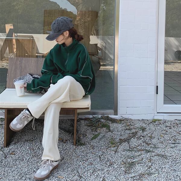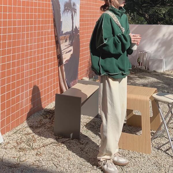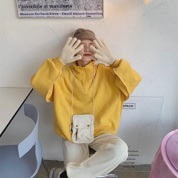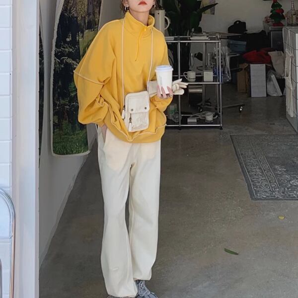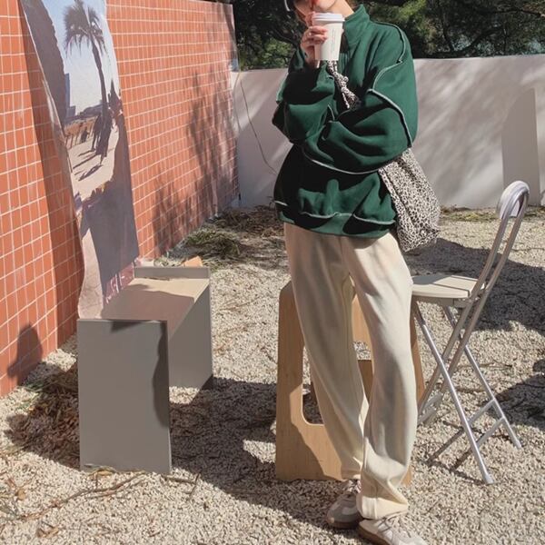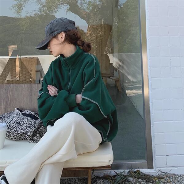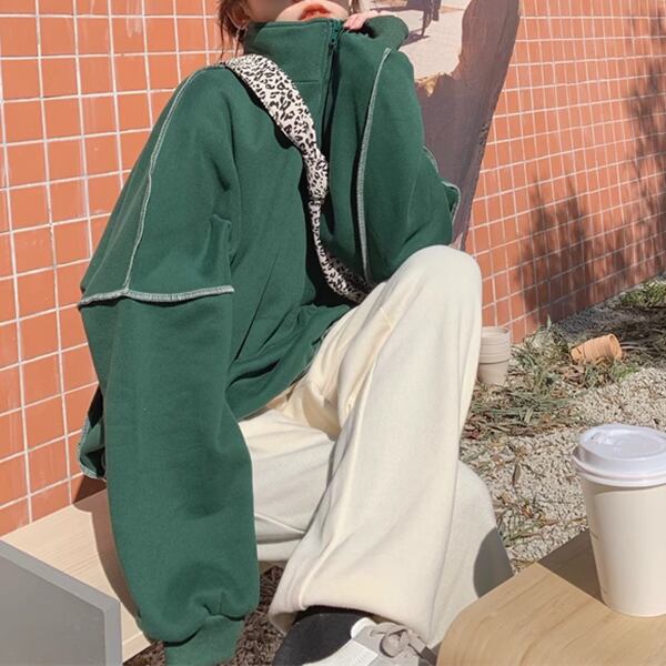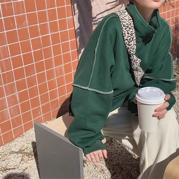 =アメリカンスタンドアップカラートップス=女性のためのステッチスウェットシャツ。ルーズなシルエットとレイジーな雰囲気、カジュアルなオーバーサイズのプルオーバーです。レトロなデザインとジャケットの融合がおしゃれ。日常のお出かけからリラックスタイムまで幅広いシーンで活躍する一着です。