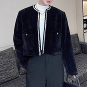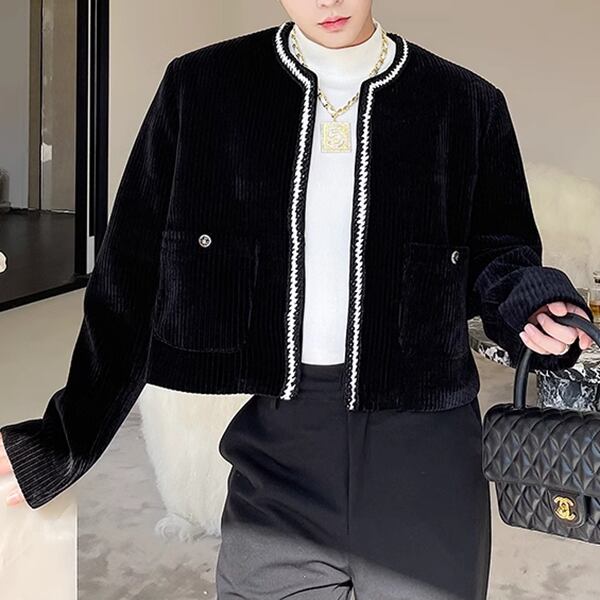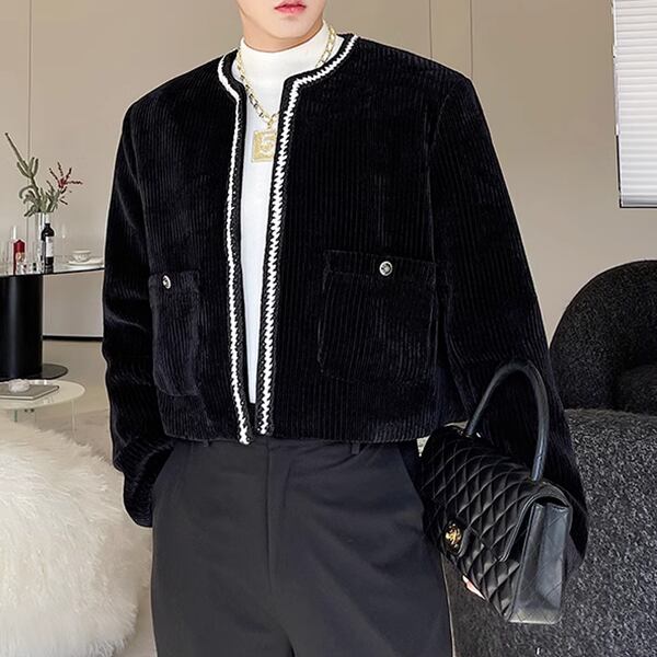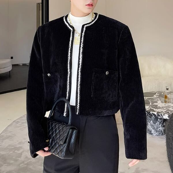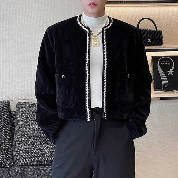 レトロな韓国バージョンのファッショナブルなニッチアイテム、コーデュロイショートノーカラージャケットです。伝統的なノーカラーデザインに韓国のエッセンスを取り入れた新たなスタイル。通常のファッションに飽きた方や、個性的なスタイルを追求する方にぴったりです。クオリティとスタイリッシュさを感じる一着です。