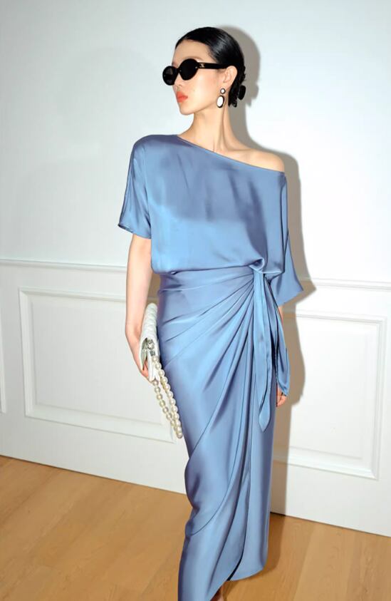 ドレス パーティー 結婚式 二次会 披露宴 フォーマル ラウンジ クラブ ロング 5分袖 袖あり ラウンドネック ワンショル 襟なし ストレート Iライン イブニング シフォン ウエストマーク ウエストリボン ハイウエスト 可愛い きれいめ シンプル 大人可愛い 上品 おしゃれ かっこいい アジアン エスニック エキゾチック 主役級 存在感 フォーマル エレガント セクシー シック 無地 イベント レストラン 脚長 女子会 光沢感 春 夏 秋 S M L カラバリ ブルー 黄色 イエロー