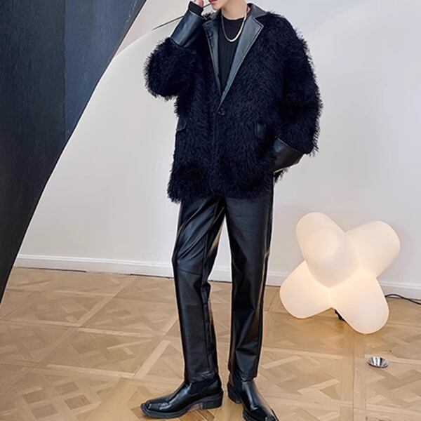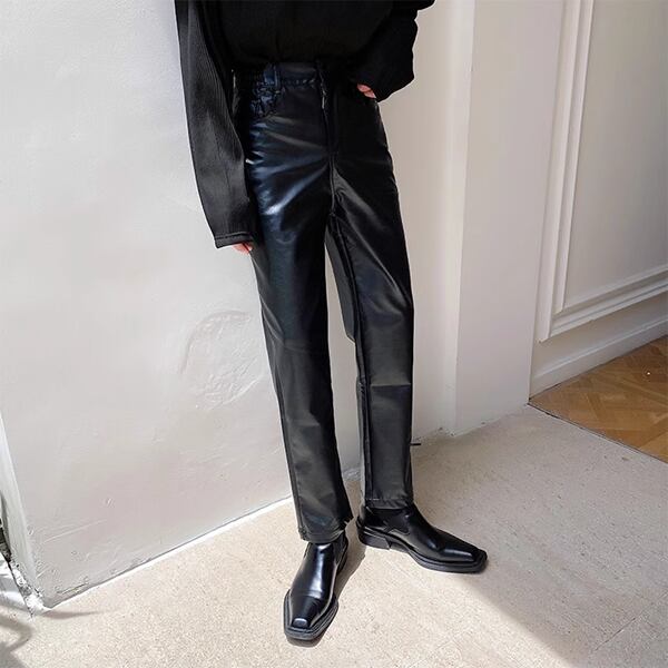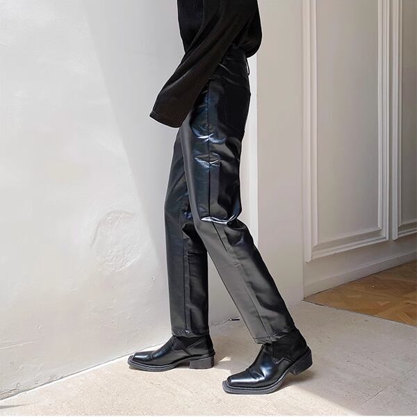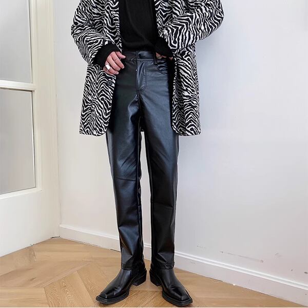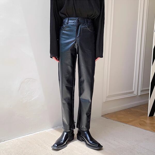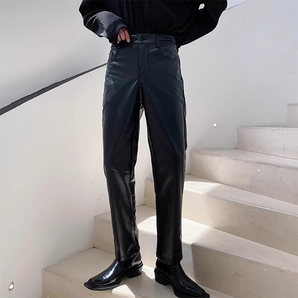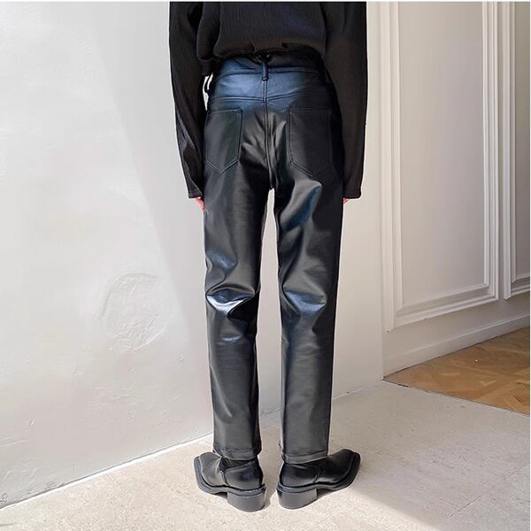 トレンディブランドハンサムメンズパンツ メンズ パンツ ボトムス ストレートスリム パンツ テーパードパンツ ロングパンツ レザーパンツスラックス ストレート Iライン フェイクレザー PU トレンディ カジュアル 上品 無地 シーズンレス オフィス ショッピング カフェ 韓国 脚長 ブラック