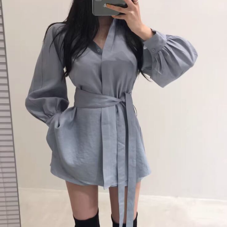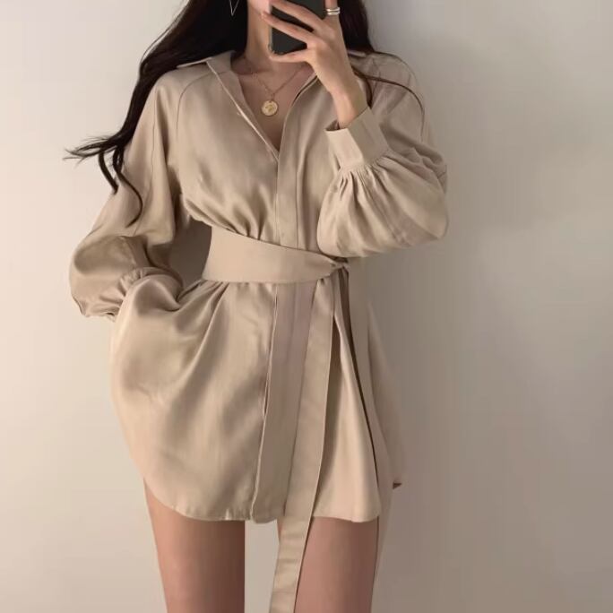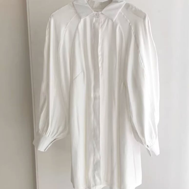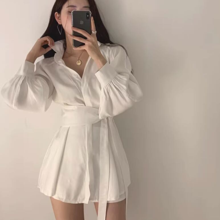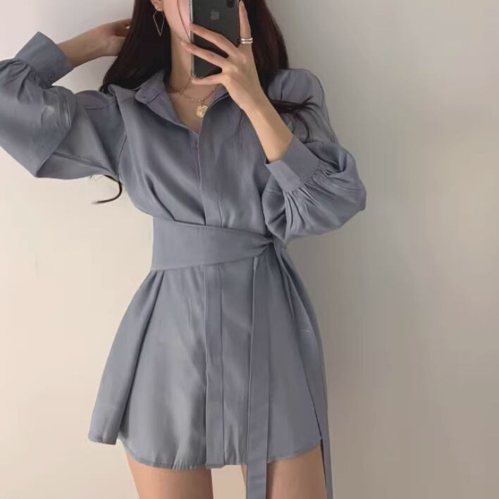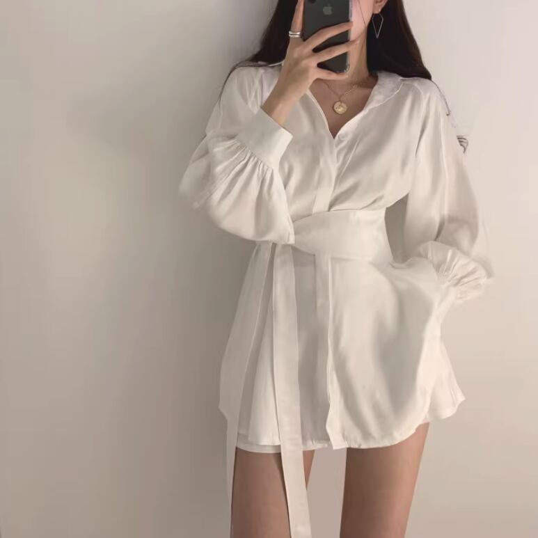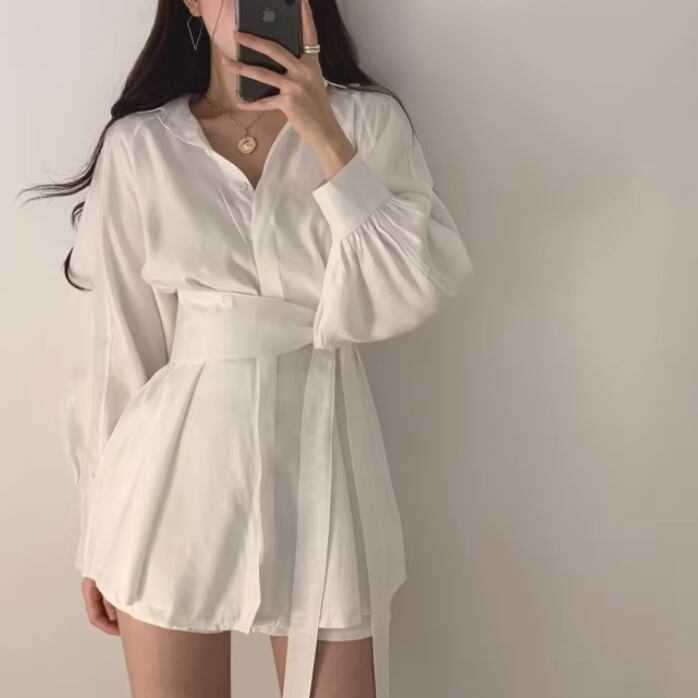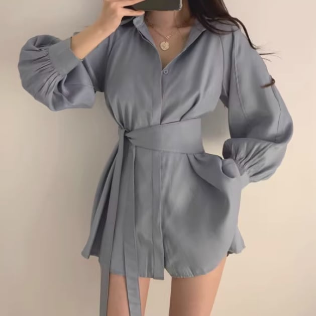 シャツはミッドレングスでウエストマークのリボンが