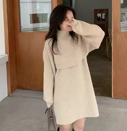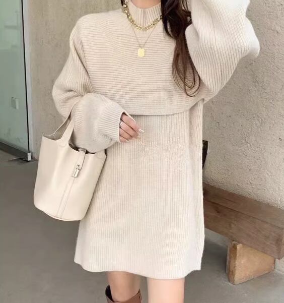 二点セット ツーピース レディース ワンピース ニット セーター プルオーバー セットアップ アンサンブル ニットワンピ ミニ ショート 袖なし ノースリーブ 長袖 ボリューム袖 ランタンスリーブ ハイネック Aライン ハイウエスト 大人可愛い シンプル カジュアル おしゃれ こなれ感 ルーズ クール エレガント ラグジュアリー セクシー シック 無地 秋 冬 10代 20代 学生 デート お出かけ 重ね着 普段使い レイヤード トレンド 流行 S M L XL ゆったり ブラック カーキ アプリコット