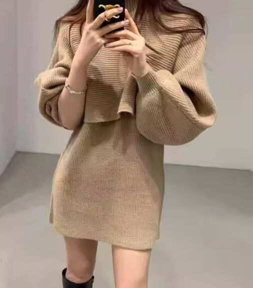 ショート丈のノースリーブニットワンピースとクロップド丈の長袖ニットセーターの二点セット。