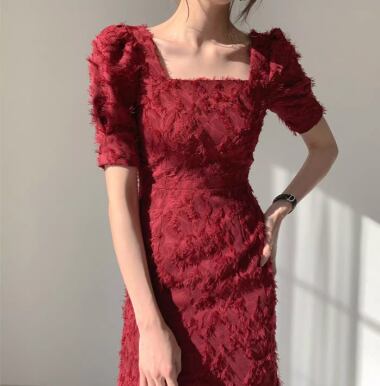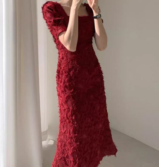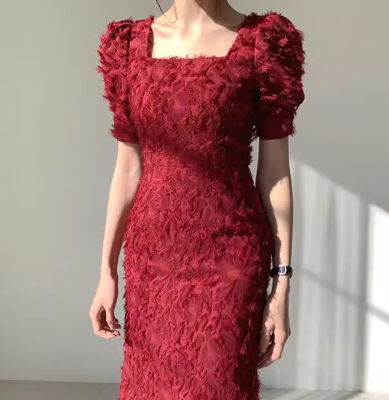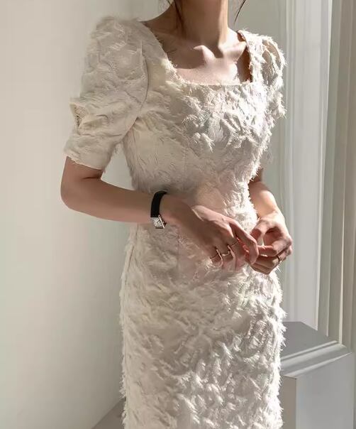 レディース ドレス ミモレ ロング 半袖 パフスリーブ スクエアネック タイト スリム 細身 背中開き ファスナー 大人可愛い きれいめ シンプル 上品 おしゃれ エレガント ラグジュアリー セクシー シック 高級感 芸術的 アーティスティック スタイリッシュ 無地 夏 デート お出かけ パーティー イベント 普段使い S M ホワイト ブラック レッド