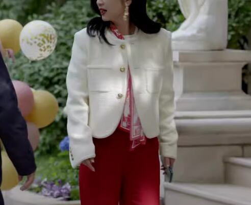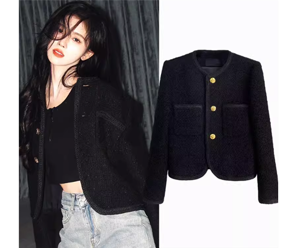 上品でエレガントな雰囲気が出るツイード素材を使用したノーカラージャケット。